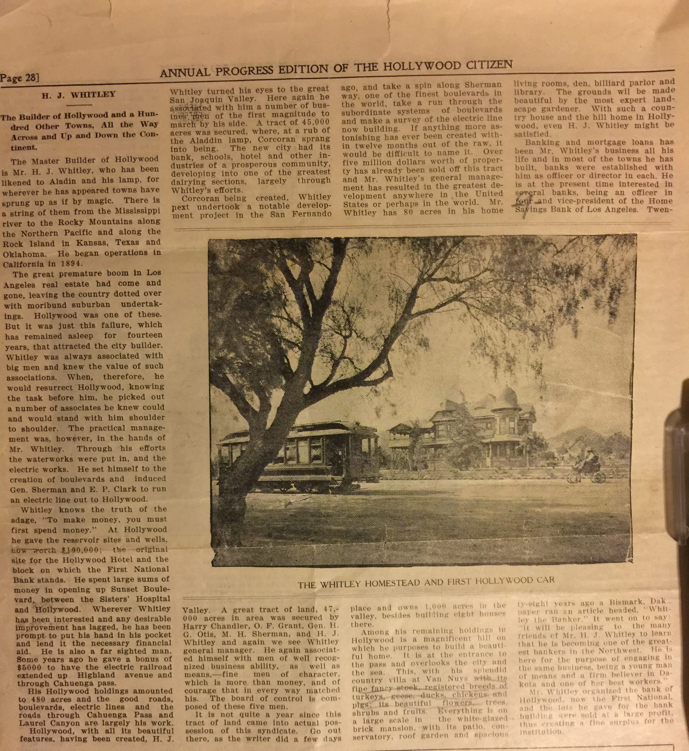 The master builder of Hollywood is Mr. HJ Whitley, who has been likened to Aladdin and his lamp, for wherever he has appeared towns have sprung up as if by magic. There is a string of them from the Mississippi River to the Rocky Mountains along the Northern Pacific and along the Rock Island in Kansas, Texas and Oklahoma. He began operations in California in 1894.